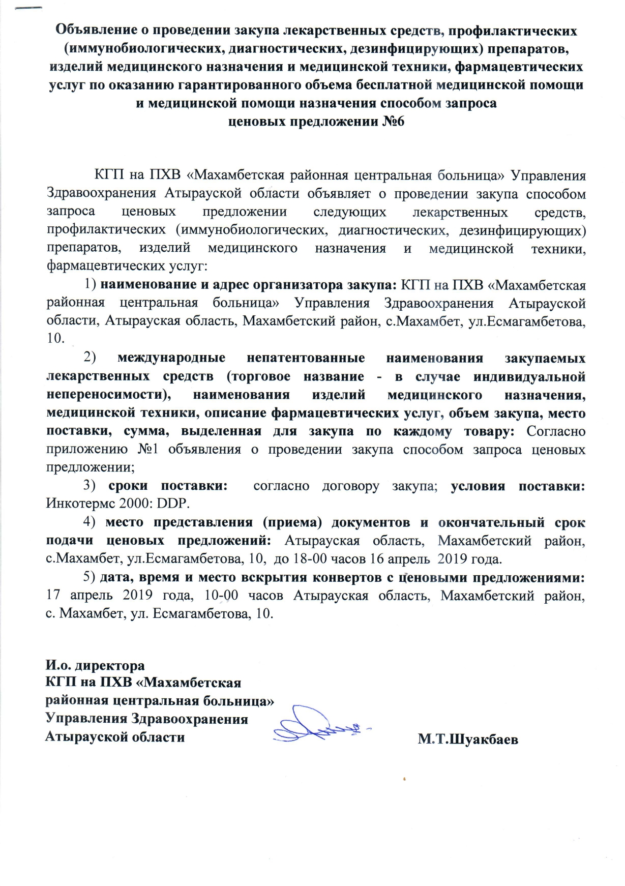 Объявление о проведении закупа лекарственных средств №6 10.04.2019