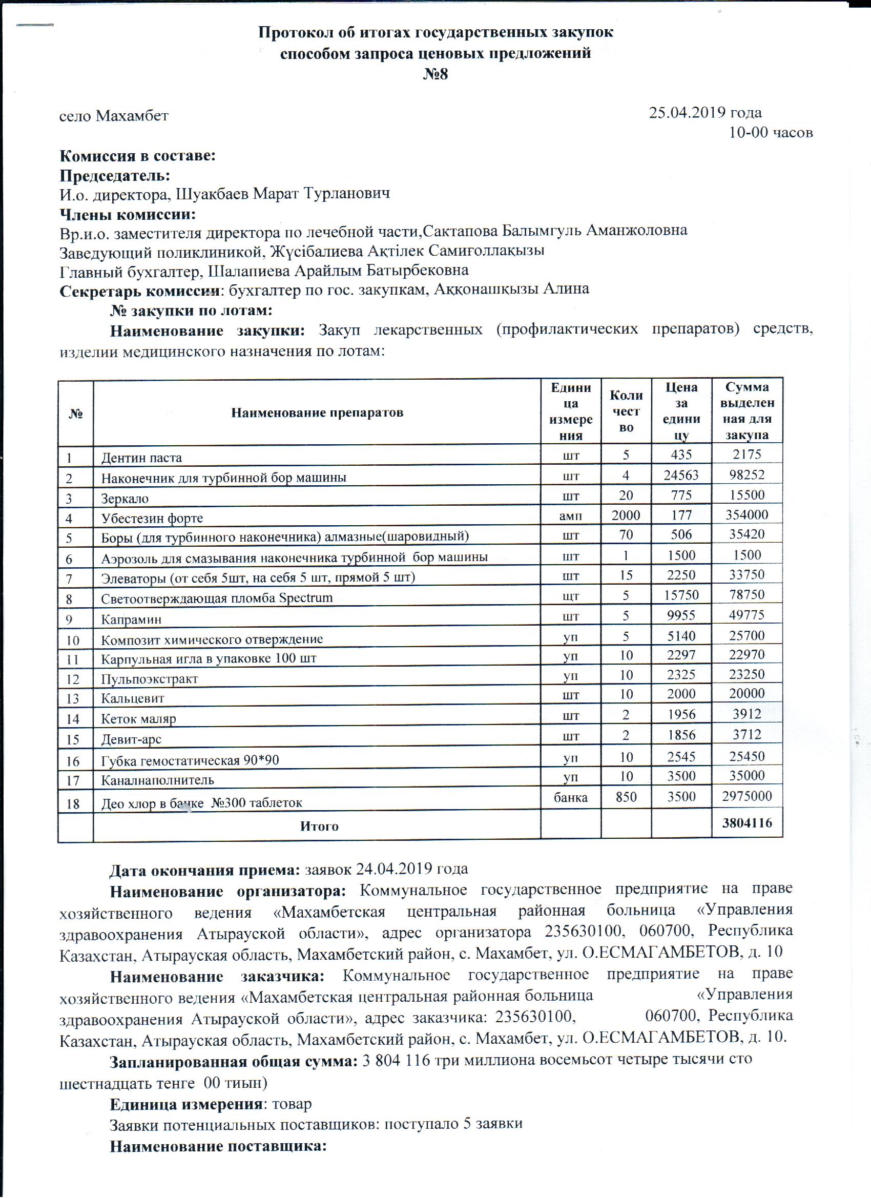 Протокол об итогах государственных закупок способом запроса ценовых предложений №8 29.04.2019 Подробнее Печать E-mail