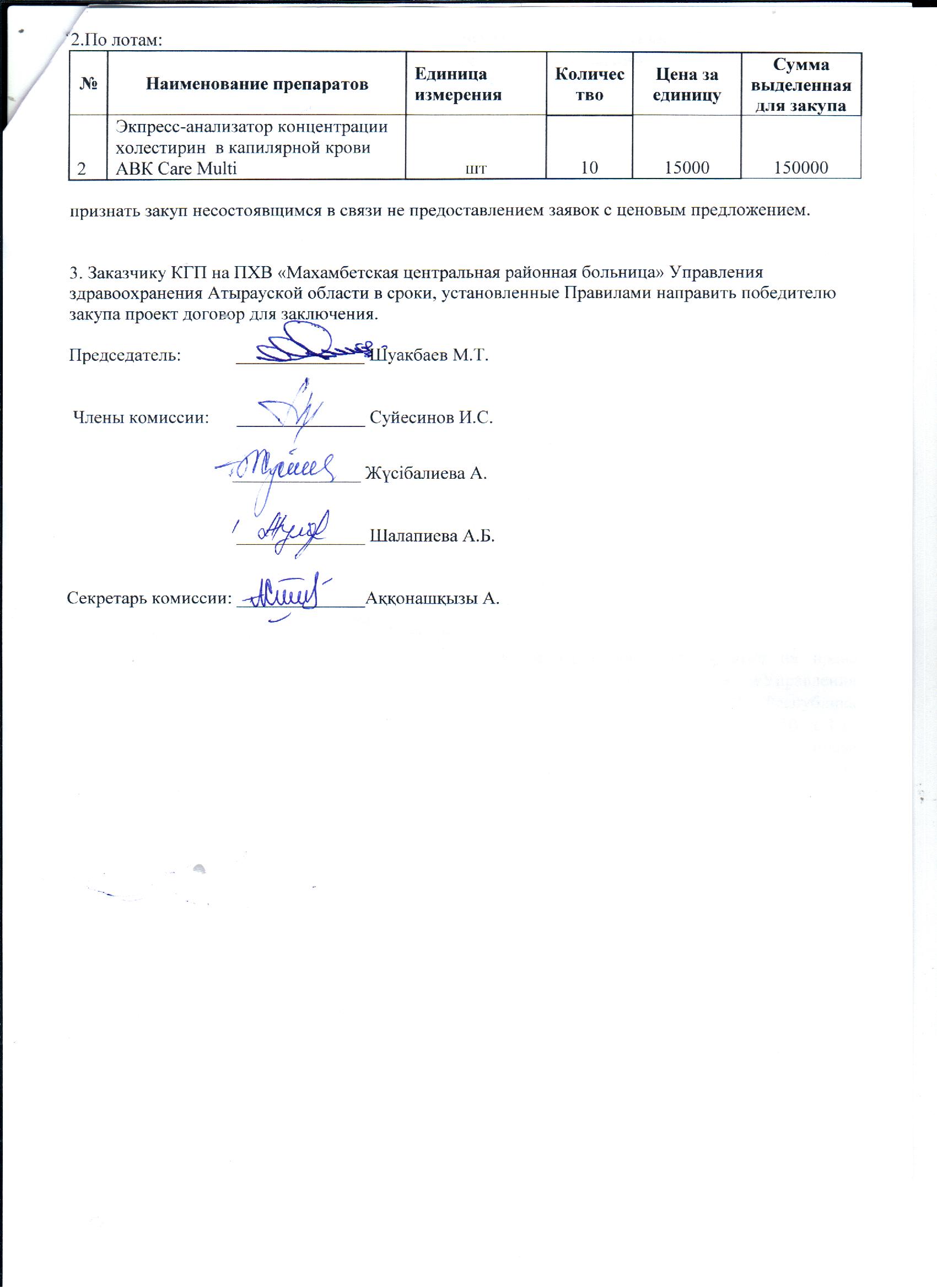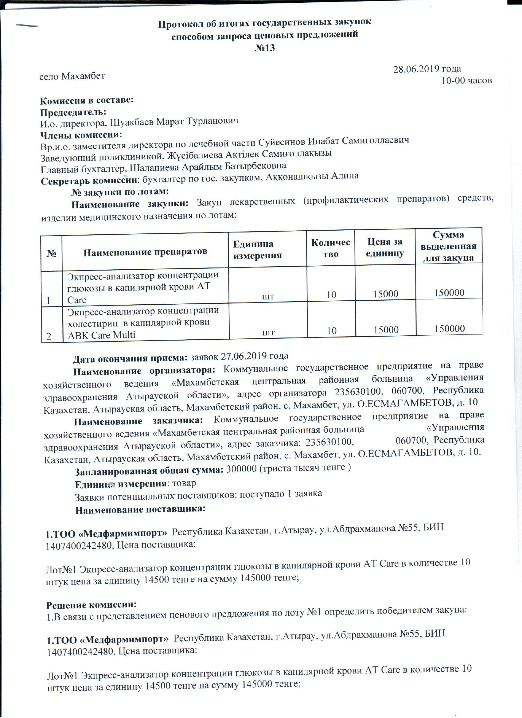 Протокол об итогах государственных закупок способом запроса ценовых предложений №13