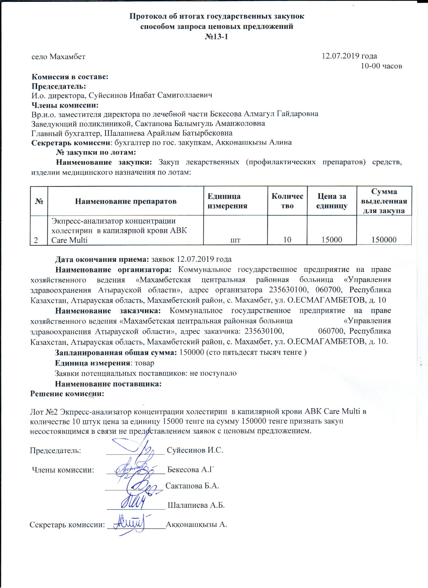 Протокол об итогах государственных закупок способом запроса ценовых предложений №13-1