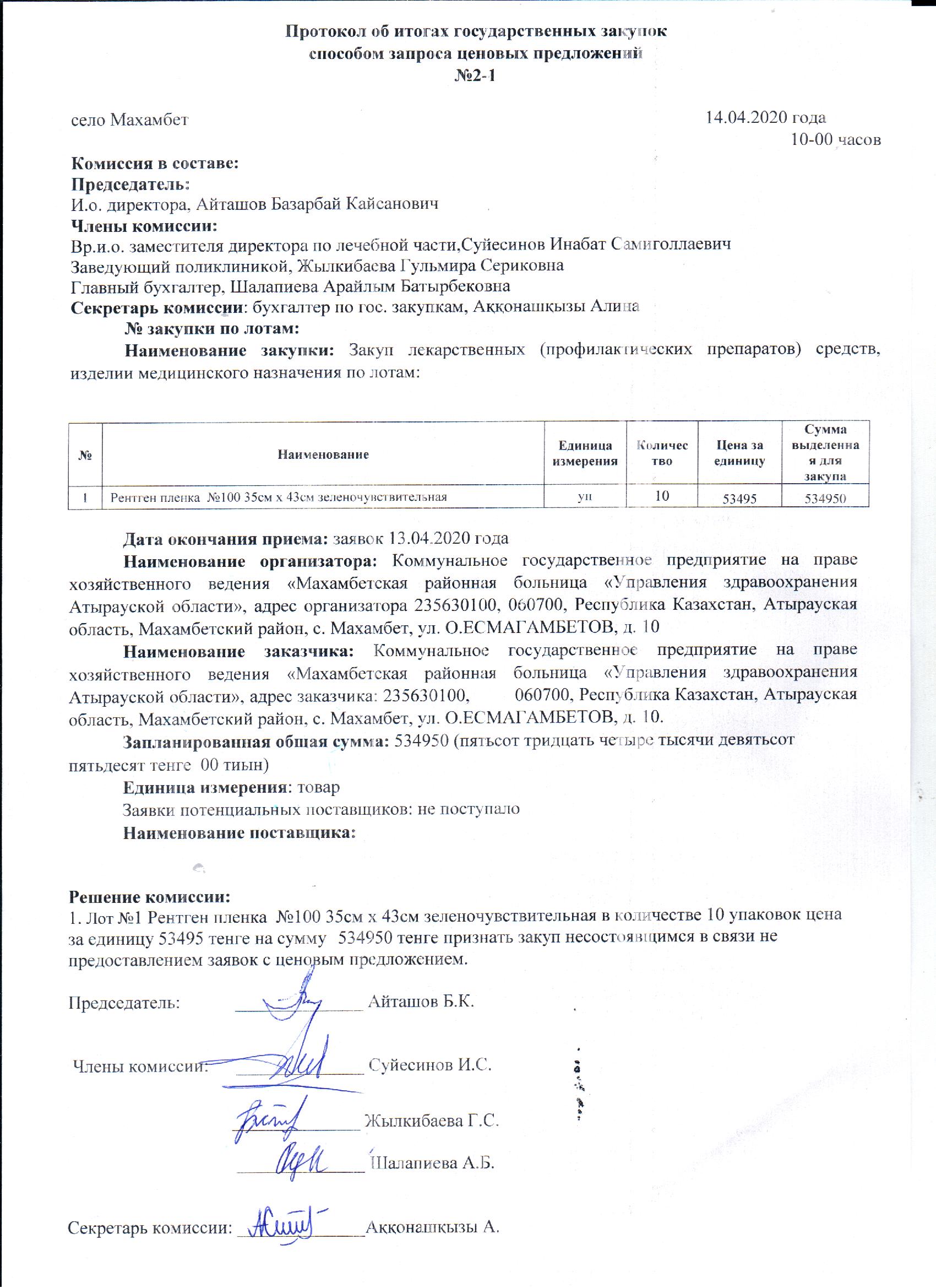 Протокол об итогах государственных закупок способом запроса ценовых предложений №2-1